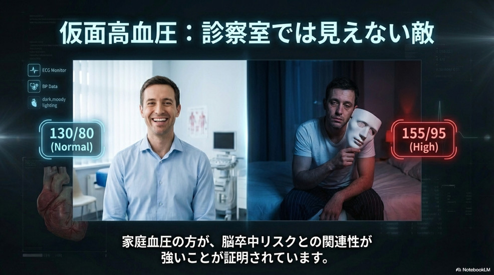 なぜなら、この朝と夜の測定が、診察室では見つけにくい「早朝高血圧」や、夜間に血圧が十分に下がらない「夜間高血圧」を発見する唯一の手がかりだからです。これらは「仮面高血圧」とも呼ばれ、脳卒中や心臓病のリスクを静かに高めることがわかっています。