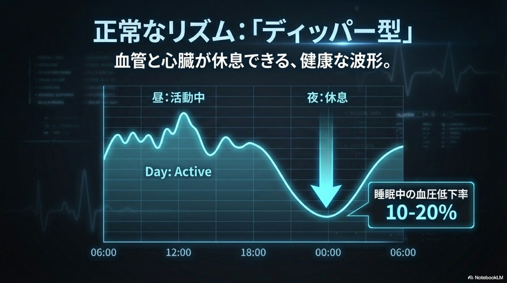 健康な人の血圧は、日中の活動時間帯に高くなります。そして夜の睡眠中には、心と体を休めるために日中の値より10%〜20%ほど低くなります。この正常なパターンを「Dipper(ディッパー)型」と呼びます。
