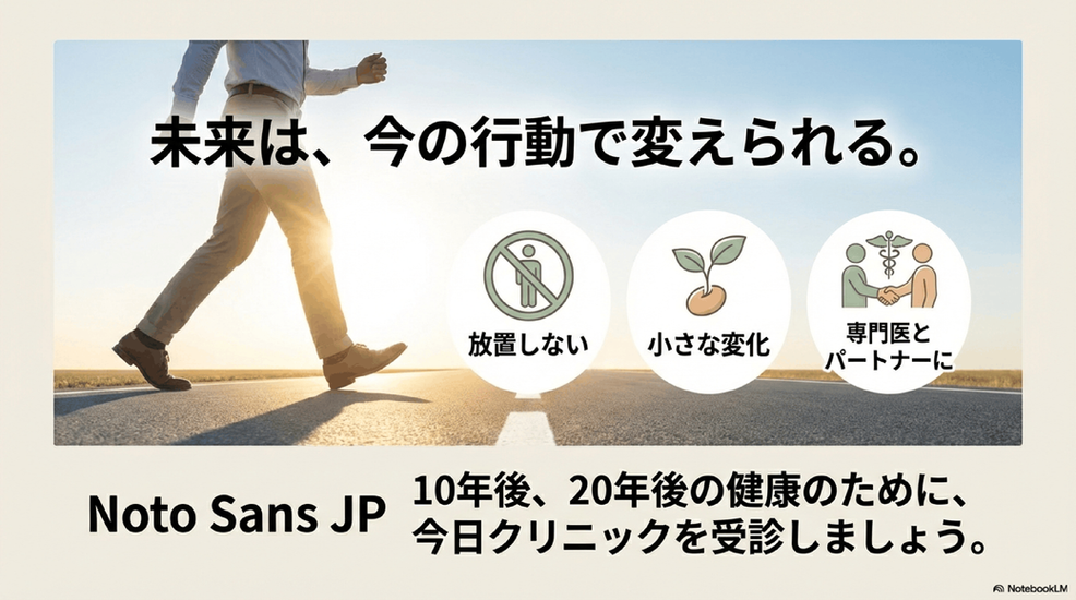 その行動が、10年後、20年後のあなたの健康な未来を守るための最も確実な鍵となります。