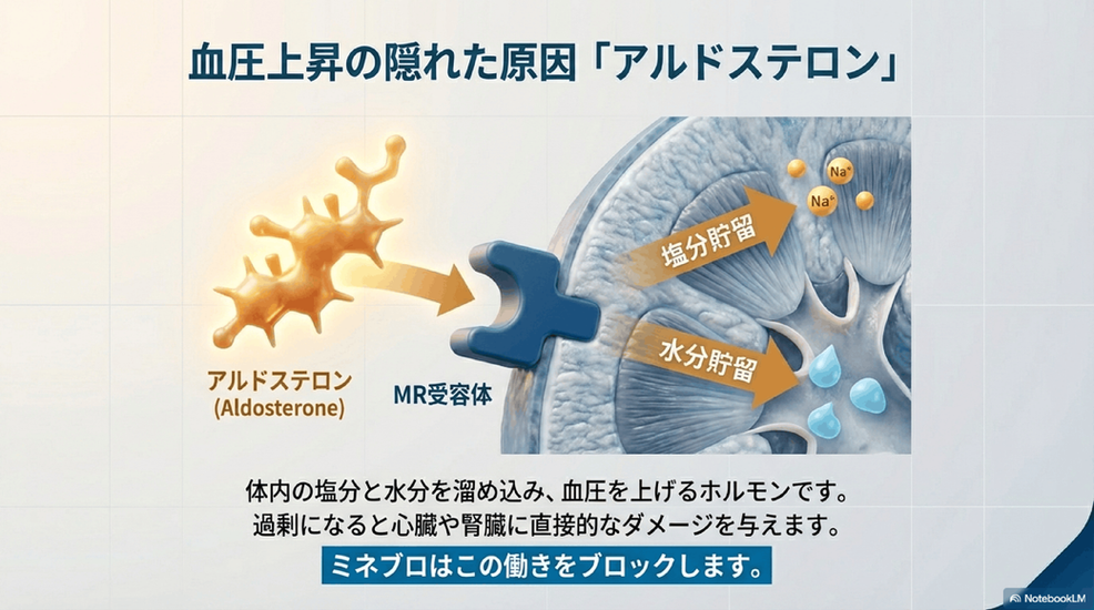 ミネブロは、体内のホルモン「アルドステロン」が過剰に作用することで起こる高血圧に、特に効果が期待できる新しいタイプのお薬です。このアルドステロンが増えすぎると、体の中に塩分と水分がたまりやすくなります。結果として血圧が上昇し、心臓や腎臓にも負担がかかってしまうのです。