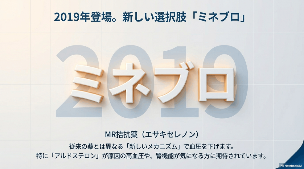 そんな高血圧でお悩みの皆さんに、2019年に承認された新しいタイプの降圧薬「ミネブロ(一般名:エサキセレノン)」が、新たな治療の選択肢として希望をもたらすかもしれません。従来の薬とは異なる独自の作用メカニズムで、特にアルドステロンが過剰に作用する高血圧や、腎機能低下を伴う患者さんにも効果が期待されています。